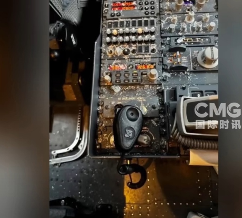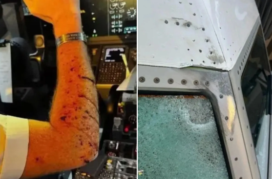 △机长手臂受伤(左),驾驶舱风挡玻璃受损(右)